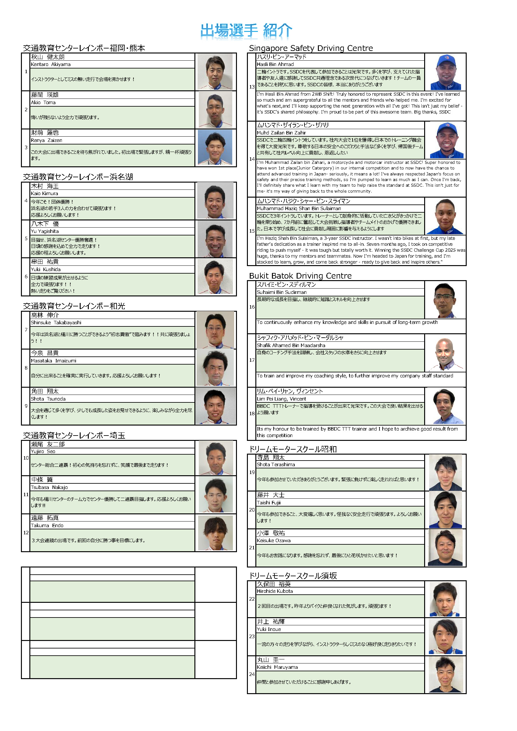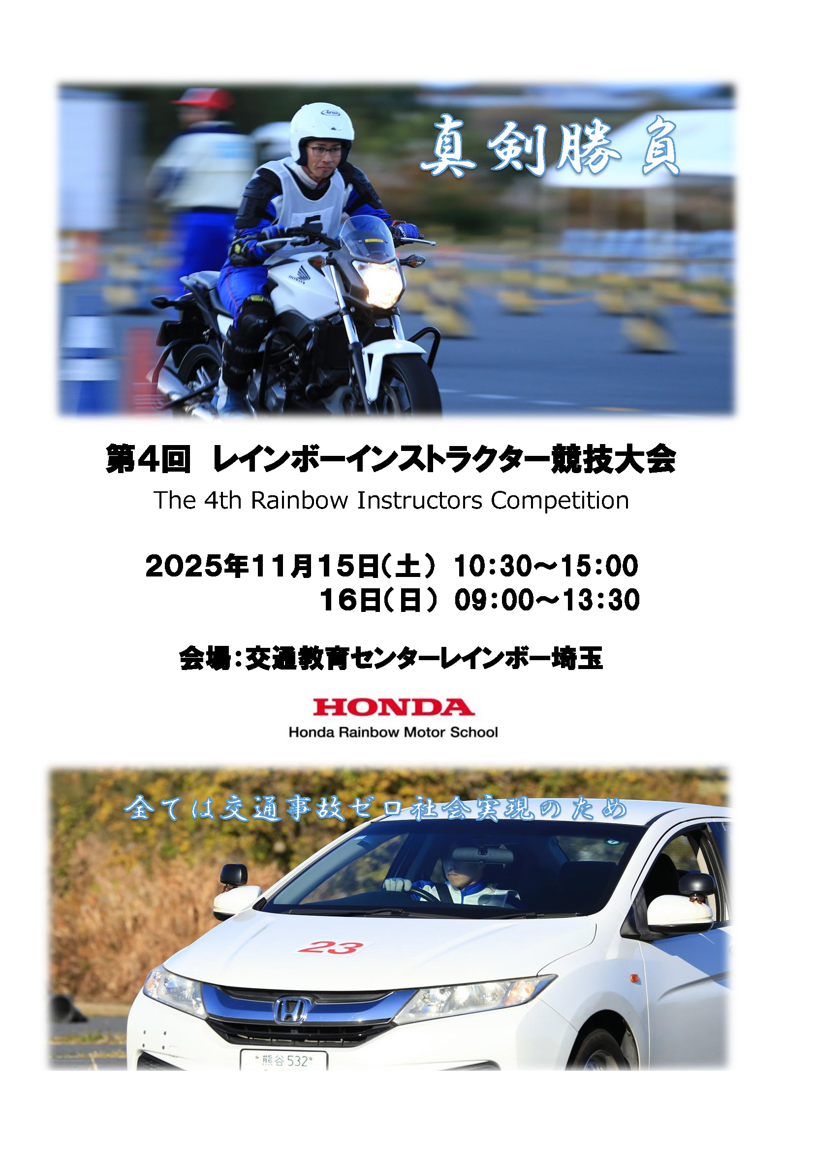 レインボーインストラクター競技大会は今回で第4回を迎えることとなりました。2025年も引き続き「交通教育センターレインボー埼玉」を会場として開催致します。全国の事業所のみならず、海外シンガポールや関連する国内教習所(長野県ドリームモータースクール)からも選手が集まり実施いたします。大会についての詳細は下記にてご案内させて頂きます。どなたでも楽しんでいただけるよう観戦無料でございます。皆様からの応援お待ちいたしております。