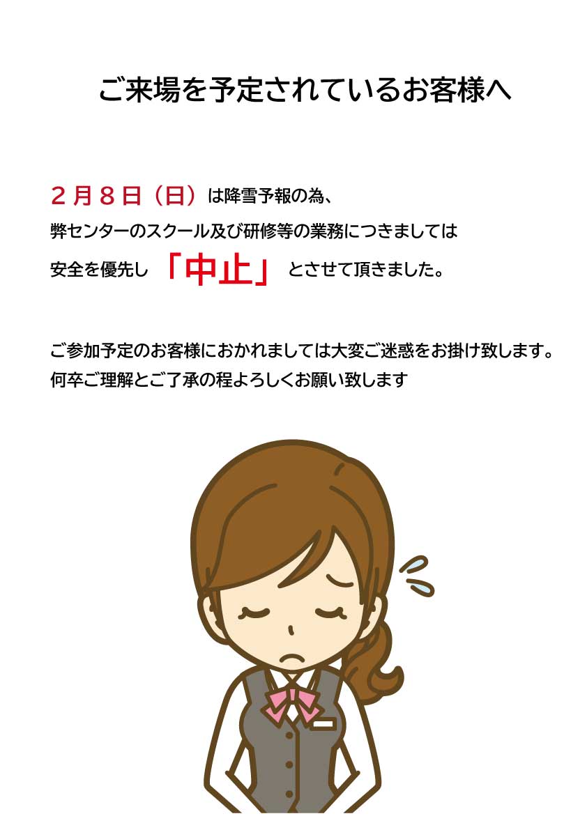 スクール・研修の開催につきましては、降雪・路面凍結の恐れがある為「終日中止」を決定致しました。
