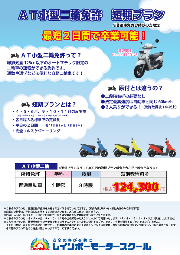 ※通常プランでのAT小型二輪限定は随時受付しております。